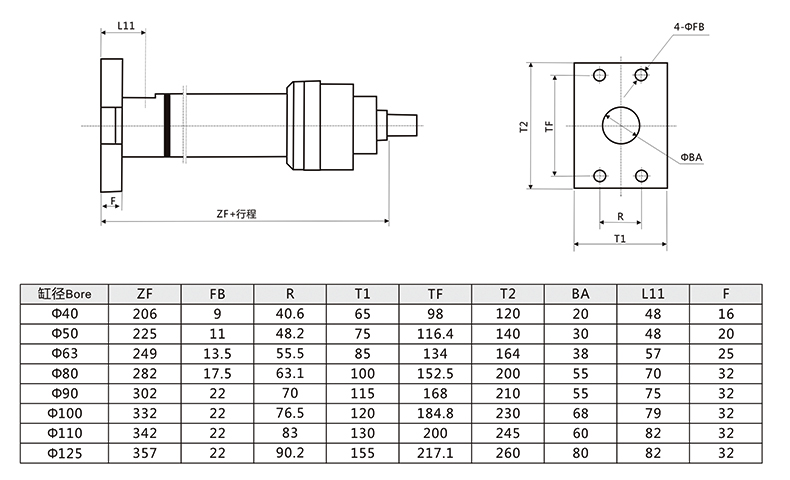 冶金液壓缸尾部長(zhǎng)方法蘭外形安裝尺寸圖