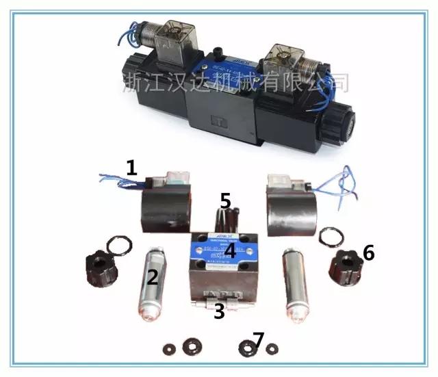 (電磁閥組裝:1代表燈頭線圈,2鐵芯,3閥芯,4閥體,5螺絲,6底帽,7墊片)